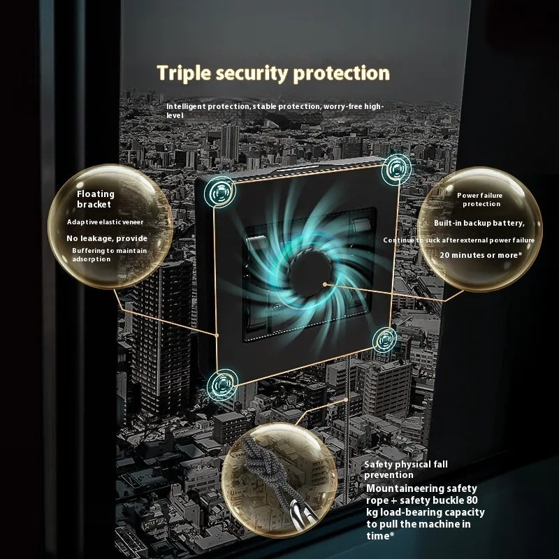 Er verfügt jedoch über eine integrierte Notstrombatterie, die den Roboter bei Stromausfall bis zu 30 Minuten sicher am Fenster hält.